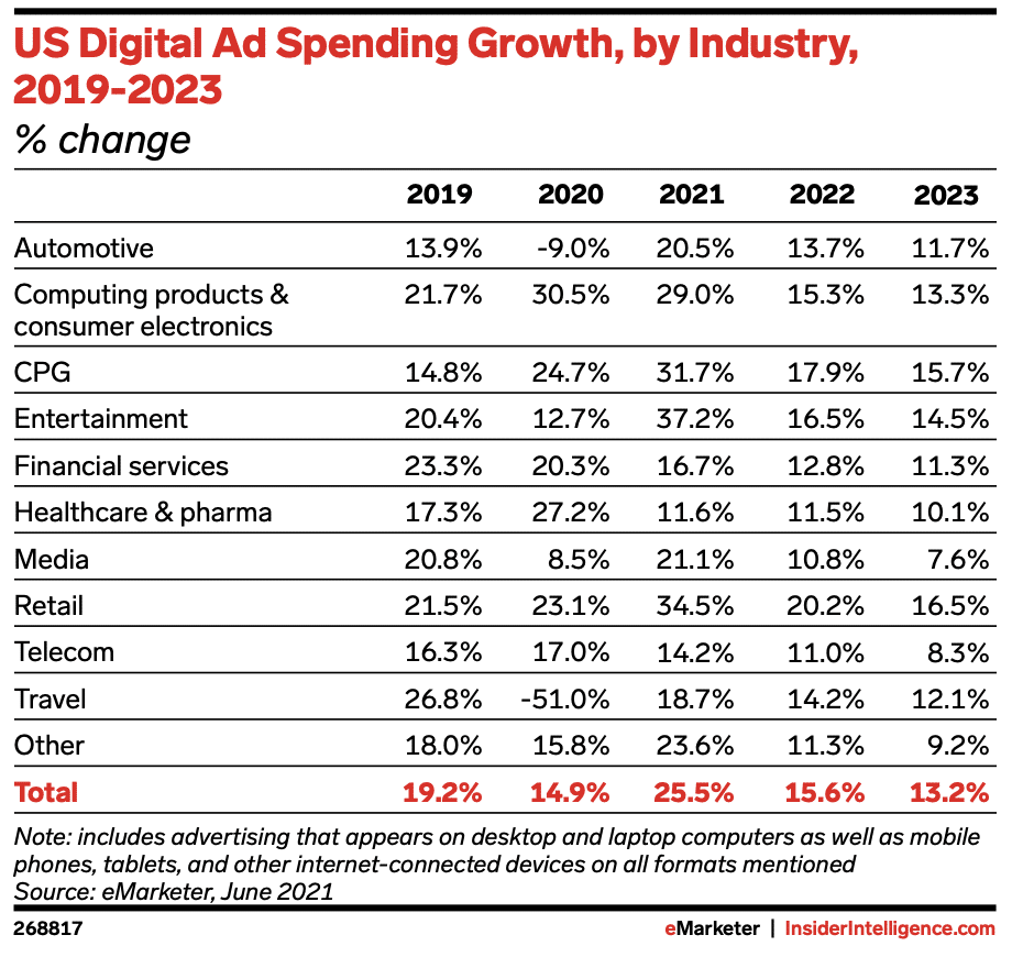 After a rollercoaster of a year in 2020, it is estimated that US digital ad buyers will spend $191.09 billion in 2021, a 25.5% increase over last year. Curious to see where your industry stacks up? We’ve rounded up eMarketer’s 2021 digital ad spend report below.