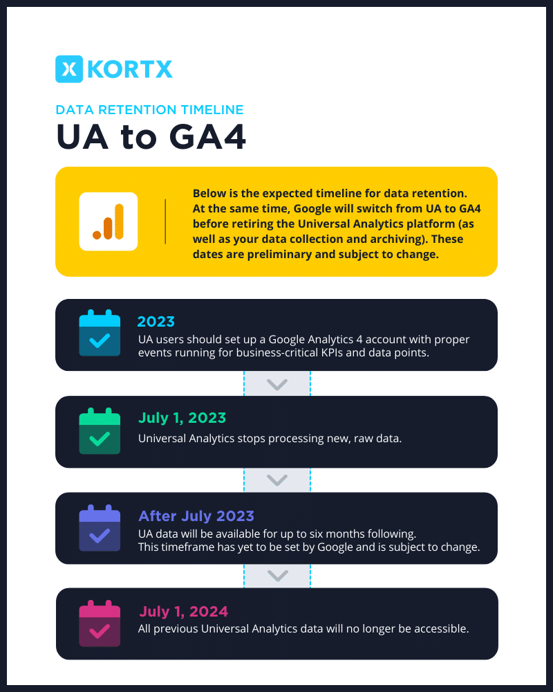 KORTX can help you with the transition to GA4, archiving your Universal Analytics data, and creating dashboards to get the most out of your archived and current data!