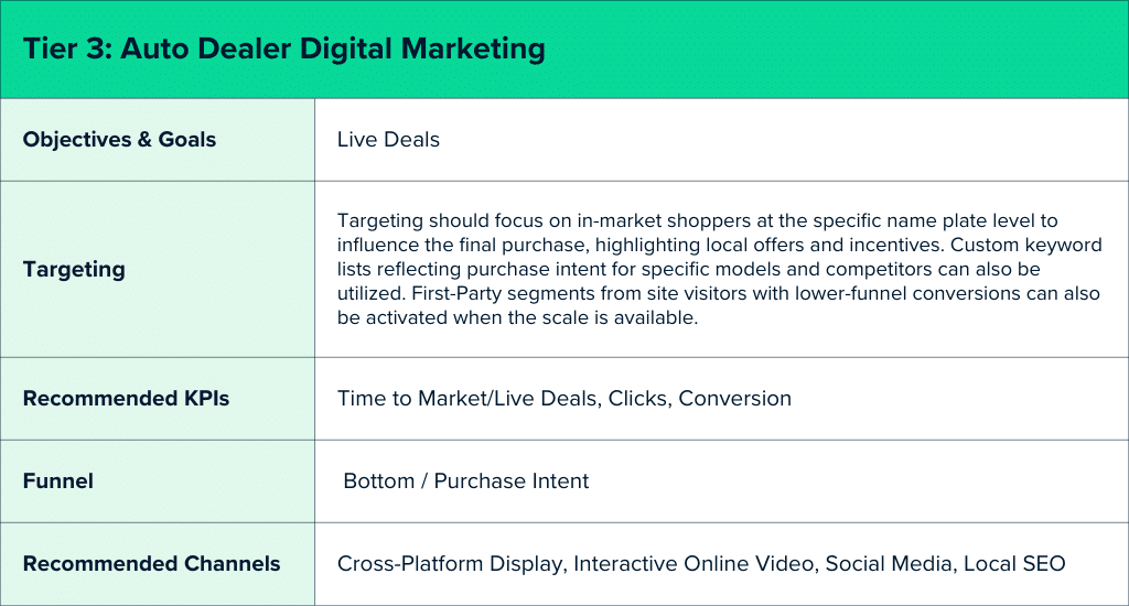 Tier 2 focuses on a localized advertising strategy concentrated on mid-level consideration, aimed at identifying potential qualified auto buyers and moving them closer to purchase. The objective is to target consumers who have narrowed their consideration set and are receptive to offer-based creative with specific calls to action. Display ads and Video tactics, such as Online Video, Cross-Platform, and Native Display, can effectively showcase vehicle attributes and drive efficient scale, especially with DMA-targeted campaigns aligned with regional dealer groups. Granular targeting based on buying signals exhibited beyond the awareness phase, incorporating First-Party data from site visitors or CRM lists, is crucial to Tier 2’s success.