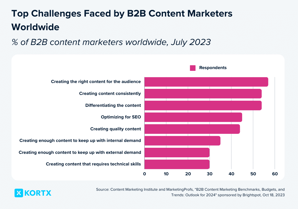 57% of B2B content marketers struggle to create the right content and 54% struggle with consistency and differentiation. Generative AI helps overcome these challenges. Over half (51%) use generative AI for brainstorming, and 45% use it for researching headlines, keywords, and writing drafts.