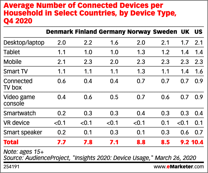 According to eMarketer, the average US household contains more than ten unique connected devices ranging from laptops and mobile phones to gaming consoles and connected TVs.