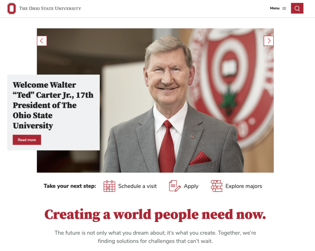 The Ohio State University’s homepage features an intuitive design where students can immediately take their next step, whether to schedule a visit, apply, or explore majors. This guides students through the enrollment process, from awareness to decision-making.