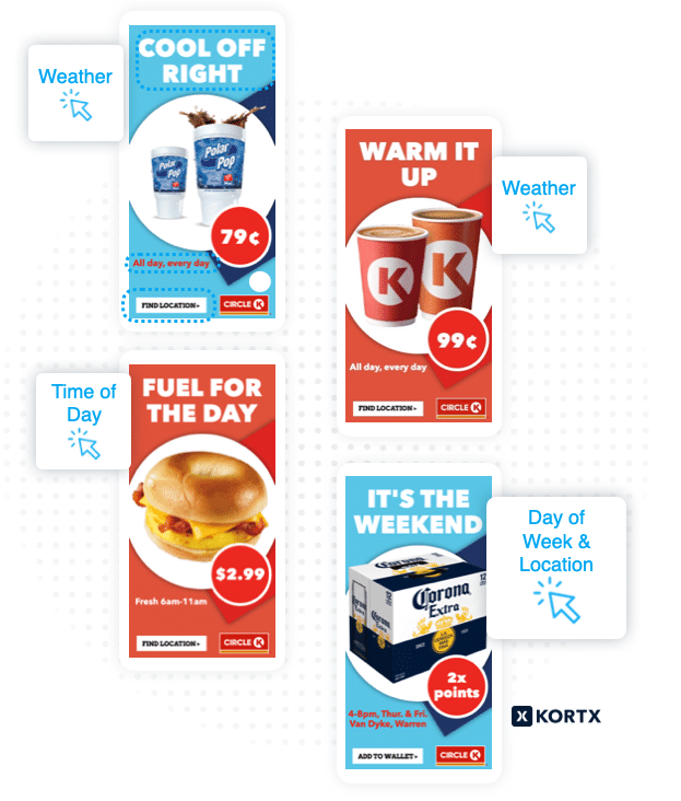 Dynamic ads provide a tailored experience for each customer. These ads change based on location, time of day, weather, and other factors and can present relevant offers or coupons.