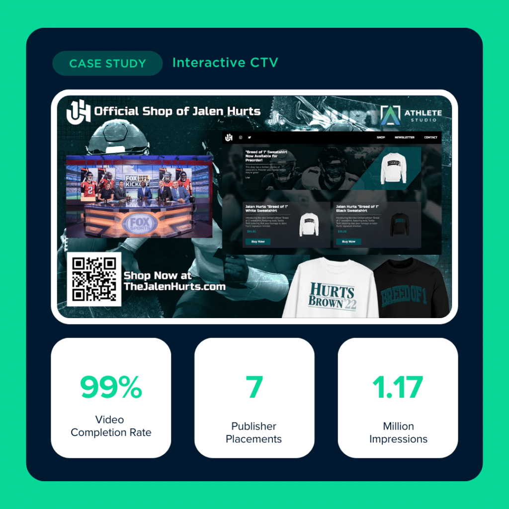 So, Flynn and KORTX came up with a game plan and helped Athlete Studio utilize Picture-in-Picture (PiP) CTV during the game, showcasing the latest merchandise from Eagles QB Jalen Hurts. This strategy allowed Athlete Studio to leverage over 7 hours of FOX and FOX Sports live coverage.