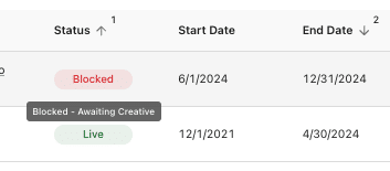 Reminder: A “Blocked” status indicates that something is missing from the campaign, preventing it from going live (i.e., creative assets, pixel placement, etc.)