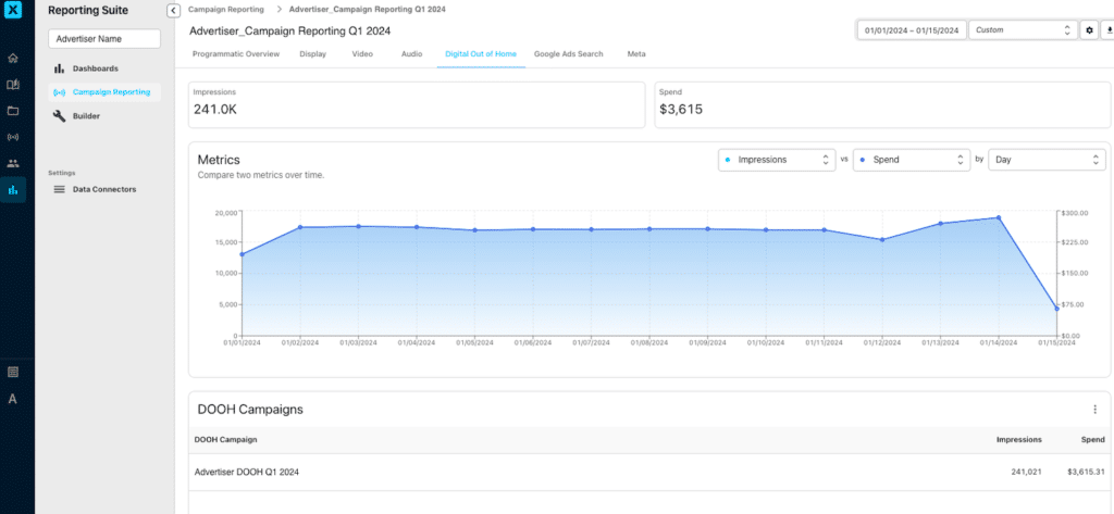 Digital out-of-home is the most recent product to integrate into Kampus directly (it’s been available as a Looker Studio embedded report until now). This report gives you real-time access to your DOOH metrics, including impressions and spend by venue and content.