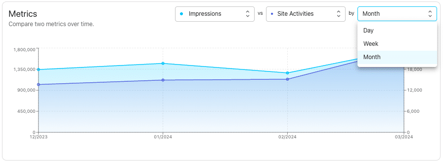 You can now visualize your selected data by day, week & month. This visualization allows you to analyze your data across your chosen timeline. Additionally, you can now hone in on a single metric to visualize by closing out one of the two metric options at the top.
