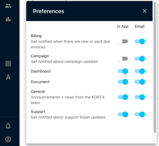 Users can also customize their notification preferences (found when you navigate to the bell icon on the bottom left). You can opt out of each notification specific to in-app (only notify when logged into the campaign) or via email.