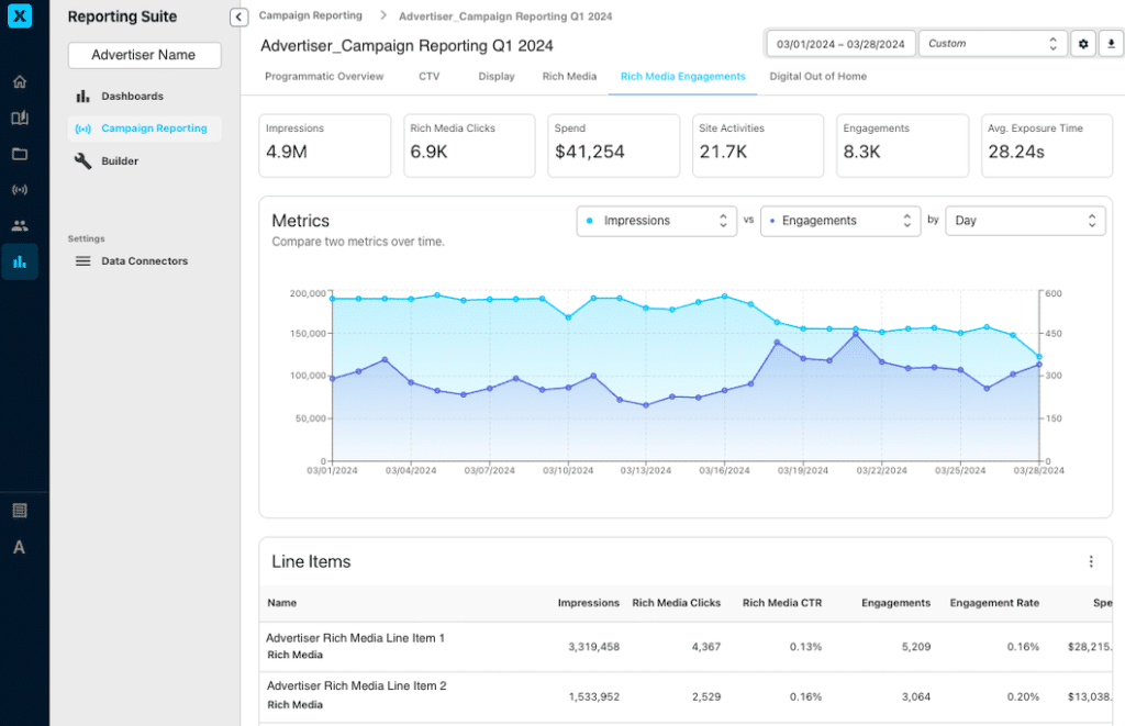 These data points now have their dedicated “Rich Media Engagements” report, which can be found as a tab within a campaign’s reporting. It is important to note that this report is separate from the Rich Media report, which houses the DSP-level reporting (impressions, clicks, conversions, etc.).