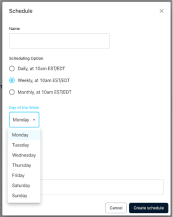 When scheduling an automated report, users can select their preferred day for weekly reports and choose any day of the month for monthly reports. This customization ensures reports are received at the most convenient times.