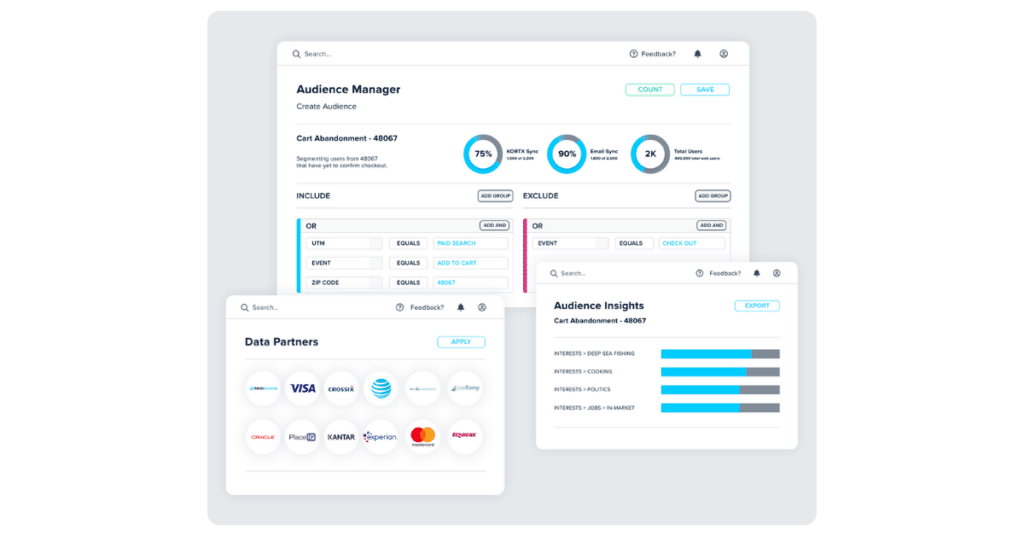 Axon Audience Manager, KORTX’s proprietary platform, is a testament to our data-centric approach and technological prowess. Axon’s audience builder takes the data-driven approach to new heights, offering virtually limitless combinations of custom audiences. It empowers clients to harness the full potential of their First-Party data, merging it with an extensive collection of user profiles and behavioral data covering 95% of the internet. This synergy transforms every site visitor into a rich, detailed user profile, enabling hyper-personalized messaging and targeted advertising experiences.