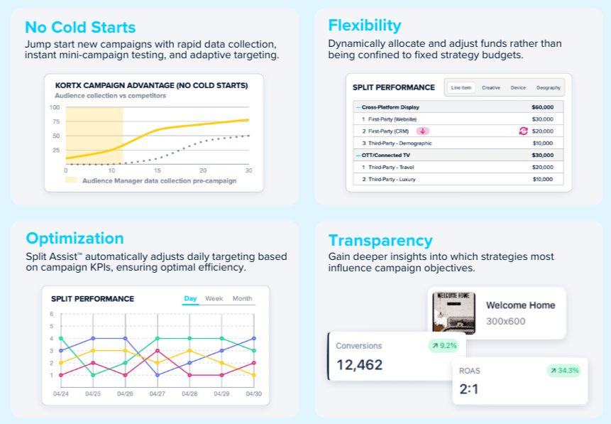KORTX combines human expertise and algorithmic optimization with Split Assist™ for optimal performance and efficiency across various client sectors, including education, restaurants, tourism, and advanced strategies like CTV. KORTX’s programmable split technology leverages machine learning for complex strategy optimization across multiple KPIs.