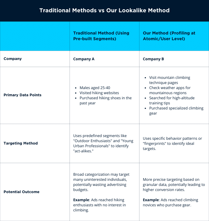 đź’ˇ It’s crucial to note that this method diverges significantly from the more conventional practice of comparing First-Party data against pre-set or “act alike” segments (e.g., “young urban professionals,” “retirees,” “new parents,” etc.), an approach we believe is biased because it relies on assumptions and generalizations.