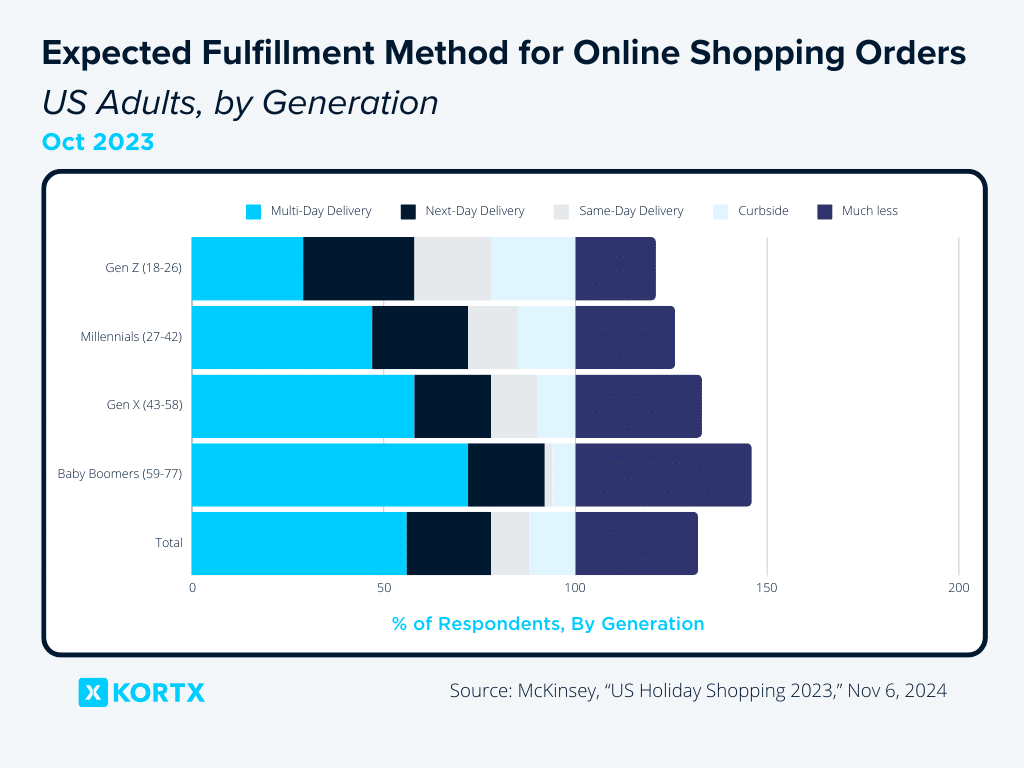 When shopping online, Gen Z expects same-day, next-day, or other omnichannel delivery options like BOPIS (buy online, pickup in-store). Millennials show more patience, but nearly 60% of both groups are willing to pay for same-day delivery, more than Gen Xers and Boomers.
