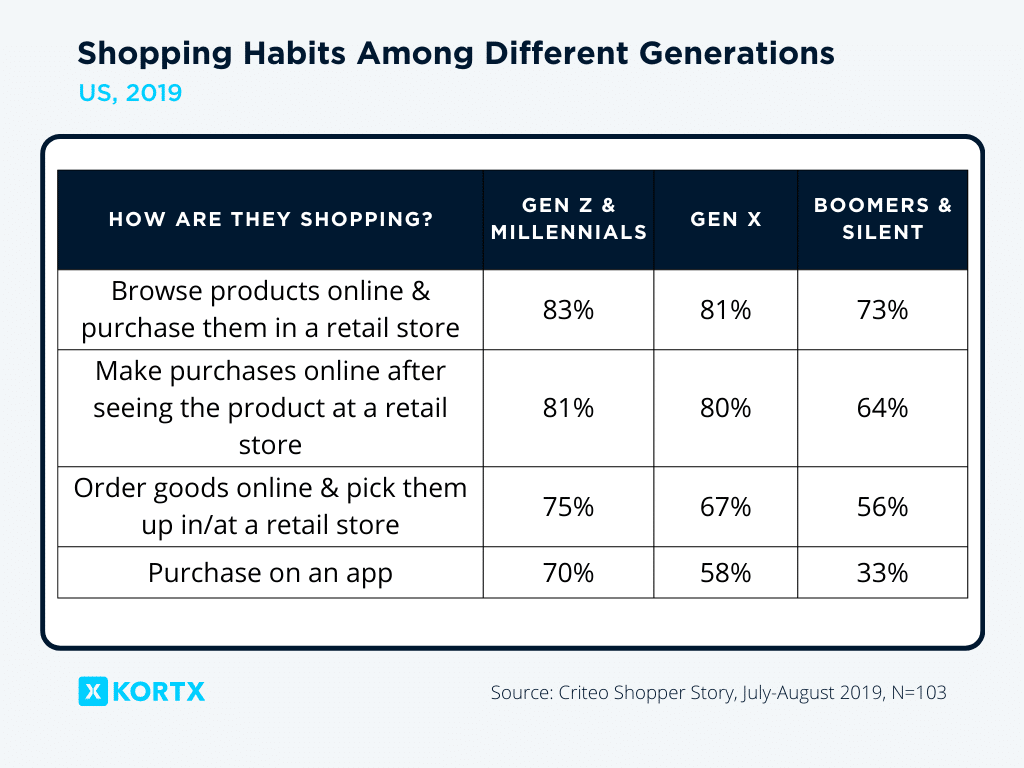Criteo found that younger generations exhibit omnichannel shopping behaviors more than older generations. 83% of US Gen Z and Millennials browse products online and then purchase them in-store (webrooming), and 81% make purchases online after seeing the product at a retail store (showrooming).