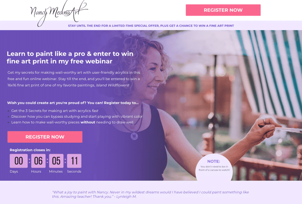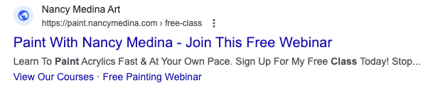For example, this ad for Paint With Nancy Medina leads to a specific landing page to register for her free painting webinar.