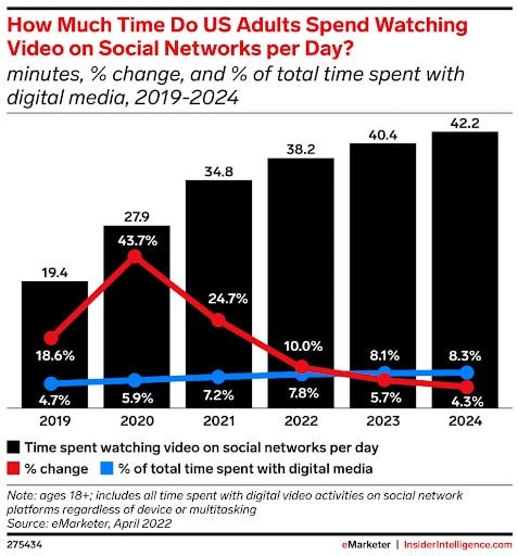 Emerging platforms such as TikTok, Snapchat, and Pinterest will continue to see significant spending increases this year compared to last. In fact, during Q1 of 2022, TikTok was the most downloaded app in the world, where time spent on Facebook decreased by 10% for all adult users in the US from 2019 to 2022.